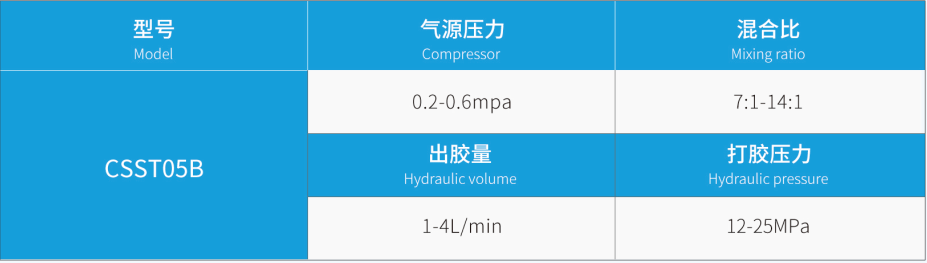 出胶连续稳定.换向平稳可靠;出胶量大,打胶压力高,出胶量调节方便;比例调节方便;胶枪混合均匀,胶枪轻,操作方便;
