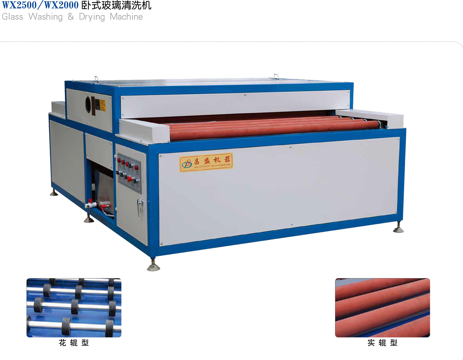该机是用于清洗厚度3-12mm平板玻璃或小于35mm的中空玻璃.机器采用水平卧式结构.玻璃放置在传送辑上,经过进料段、清洗段、干燥段,到达出料段.玻璃传送速度可根据有关工艺要求实现无级调速,机器操作方便.操作按钮集中在操作台上。