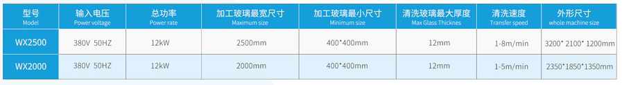 The machine is specially designed for washing 3-12mm glass and 35mm-thinner insulating glass. It adopts horizontalstructure and can accomplish the glass input, cleaning , drying and glass output. Transmission adopts frequency steplessspeed. As the operation buttons are concentrated on the table, it is easy to operate.